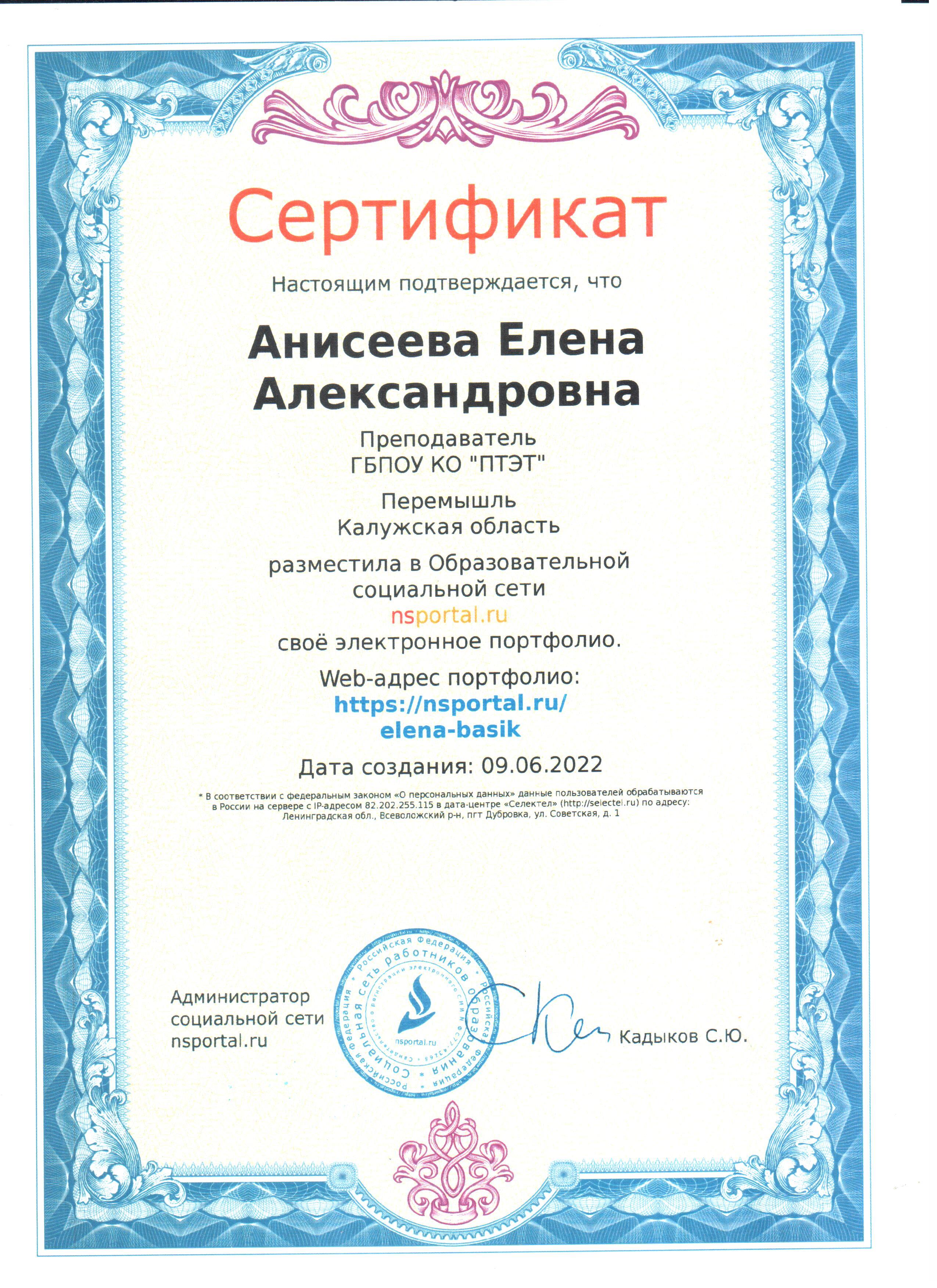 Сертификат о размещении в Образовательной социальной сети nsportal.ru своего электронного портфолио от 09.06.2022